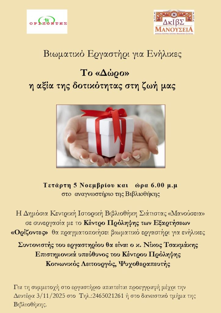 Την Τετάρτη 05 Νοεμβρίου, σε συνεργασία με την Δημόσια Κεντρική Ιστορική Βιβλιοθήκη Σιάτιστας, πραγματοποιήθηκε βιωματικό εργαστήρι με θέμα: «Το δώρο – η αξία της δοτικότητας στην ζωή μας».