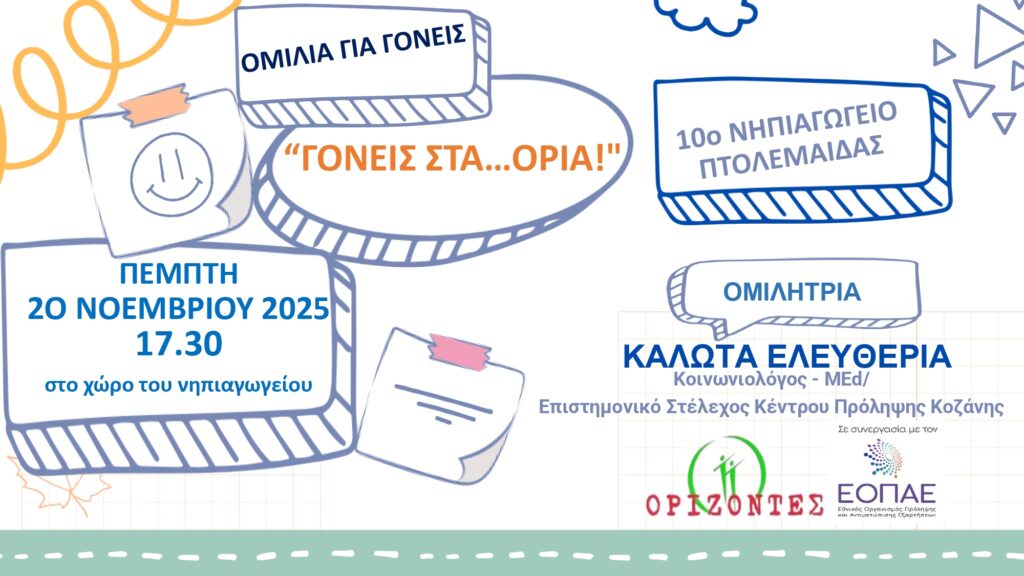 Το ΚΕΝΤΡΟ ΠΡΟΛΗΨΗΣ ΤΩΝ ΕΞΑΡΤΗΣΕΩΝ ΚΑΙ ΠΡΟΑΓΩΓΗΣ ΤΗΣ ΨΥΧΟΚΟΙΝΩΝΙΚΗΣ ΥΓΕΙΑΣ ΠΕΡΙΦΕΡΕΙΑΚΗΣ ΕΝΟΤΗΤΑΣ ΚΟΖΑΝΗΣ “ΟΡΙΖΟΝΤΕΣ” (ΣΕ ΣΥΝΕΡΓΑΣΙΑ ΜΕ ΤΟΝ Ε.Ο.Π.Α.Ε.) σε συνεργασία με το 10ο Νηπιαγωγείο Πτολεμαΐδας σας προσκαλούν σε ομιλία με θέμα: